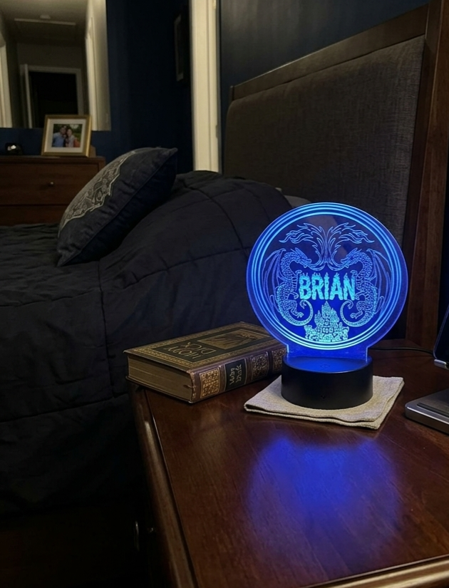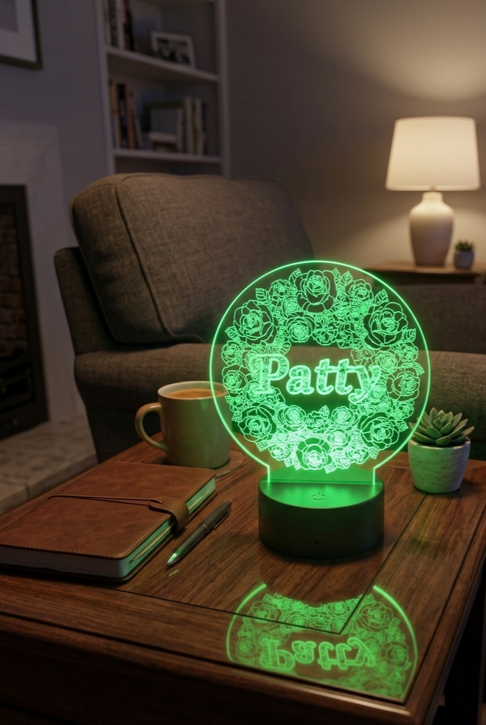 Acrylic night lights: Durable acrylic panels laser-etched with custom designs that glow evenly when illuminated. Energy-efficient LED bases provide soft, adjustable light for bedrooms, nurseries, or ambient décor. Lightweight and shatter-resistant, these night lights combine safety with clear, lasting detail.