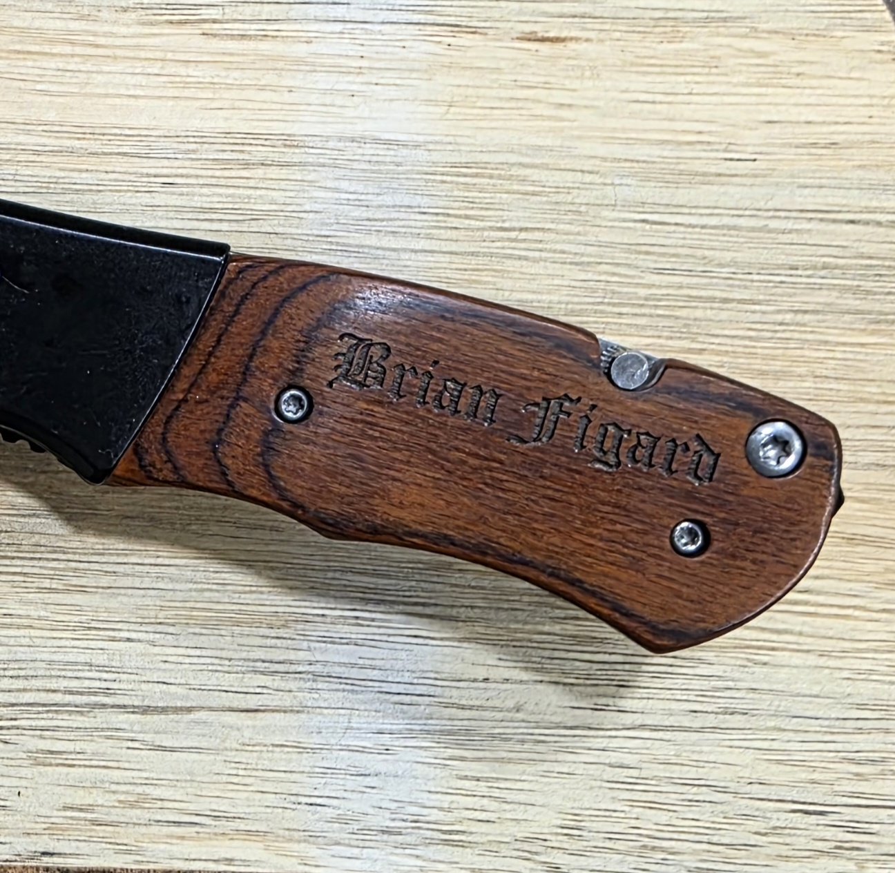 Compact metal pocket knife with a smooth wooden handle, finely engraved with a subtle pattern. The blade locks securely and folds neatly into the handle for safe carry. Lightweight and durable—ideal for everyday use, gifting, or adding a classic touch to your pocket essentials.